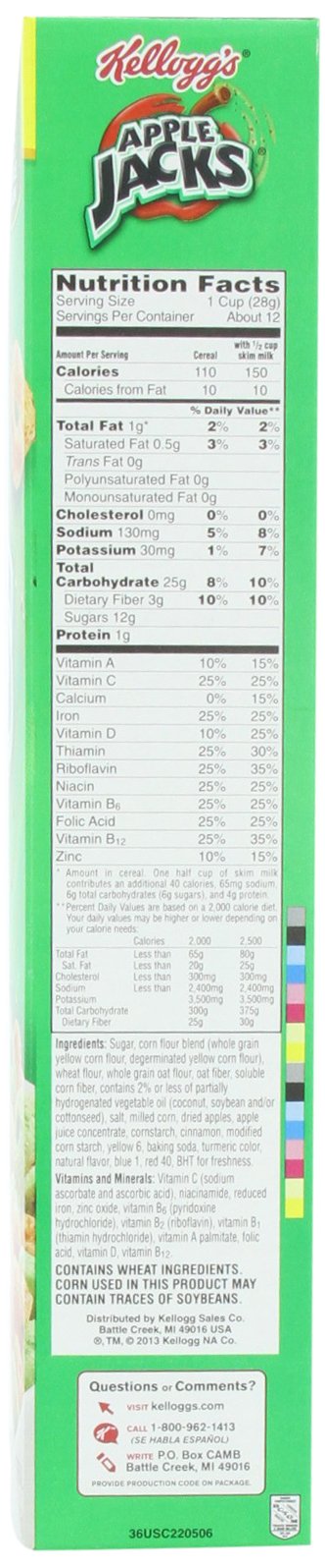 Kellogg's® Apple Jacks® Cereal - SmartLabel™ Calories 70 : Amount/Serving % Daily Value* Total Fat 0.5 g: 1%: Saturated Fat 0 g: 0%: Trans Fat ...