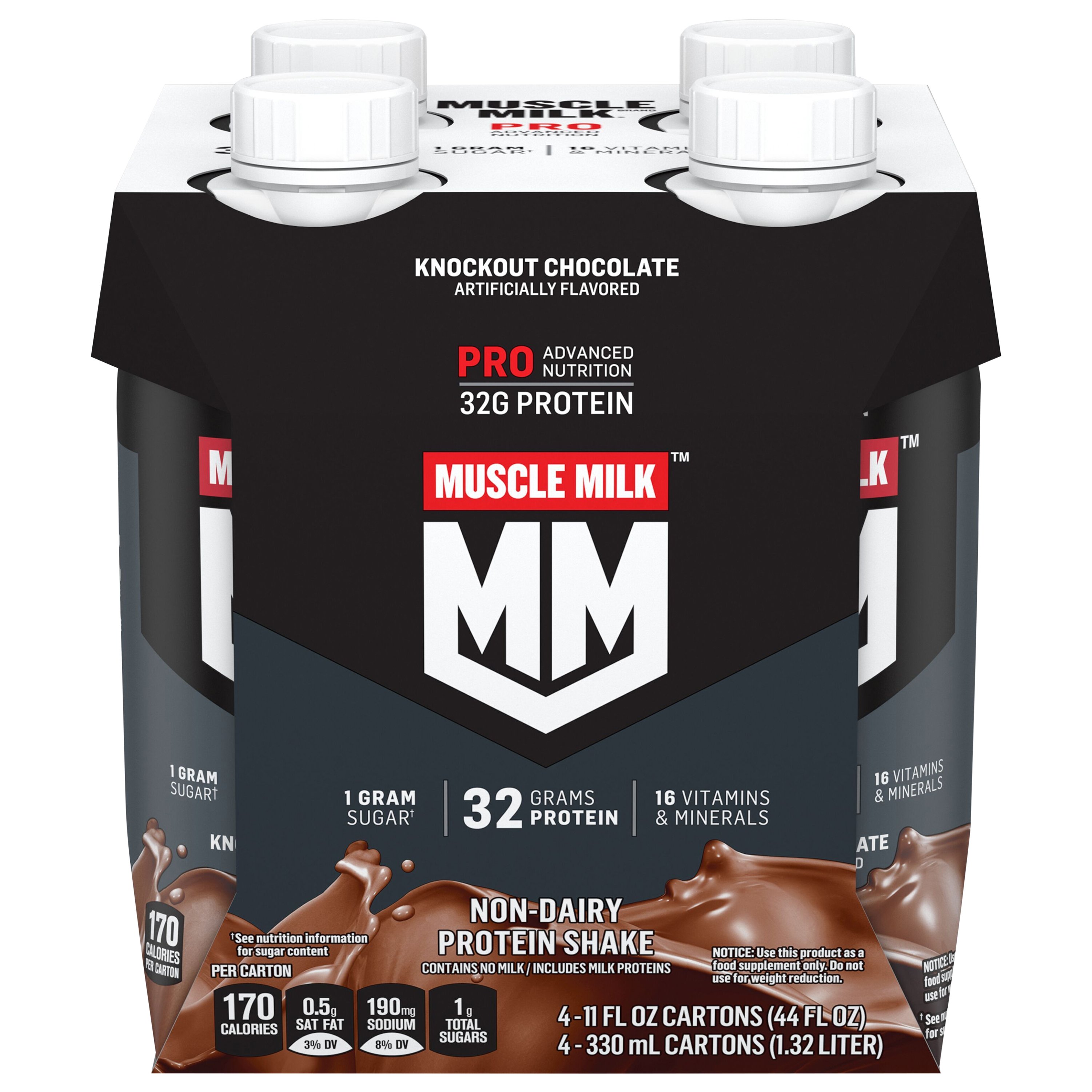 Muscle Milk Pro Series 32 Mega Protein Shake, Knockout ... Muscle Milk Pro Series 32 Mega Protein Shake, Knockout Chocolate ; Trans Fat 0g ; Cholesterol 20mg, 7% ; Sodium 230mg, 10% ; Potassium 470mg, 10% ...
