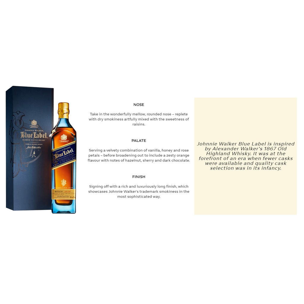 Johnnie Walker Blue Label | Total Wine & More Scotland- Created from the rarest and most expensive whiskies in the world, individually numbered and produced in limited quantities. Johnnie Walker Blue has the authentic character and flavor of a traditional 19th century blend with traces of smoke, honey and spice on the silky finish.