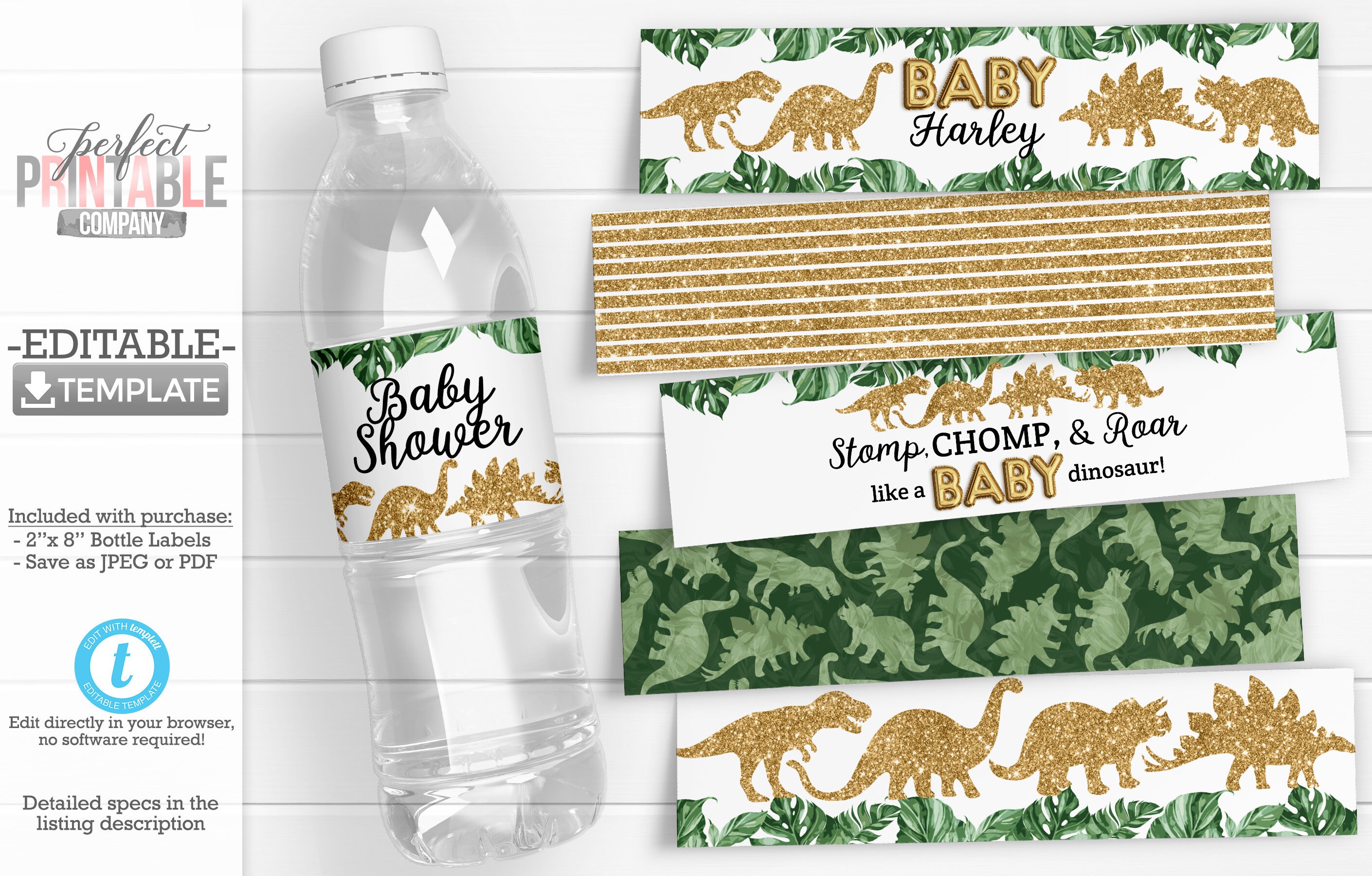 Dino Water Labels - Etsy Results 1 - 40 of 1000+ ... Dinosaur Water Bottle Label First Birthday Party Drink Label T-Rex Baby Shower Decor Dino Waterproof Sticker Favors EDITABLE Template ...