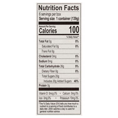 Luigi's Lemon Cherry Real Italian Ice, Lemon Cherry Check out the food score for Luigi's Lemon Cherry Real Italian Ice, Lemon Cherry from EWG's Food Scores! EWG's Food Scores rates more than 80,000 foods in a simple, searchable online format to empower you to shop smarter and eat healthier. ... For more information on nutrition concerns, read our full methodology. Contains low calorie sweeteners ... Luigi's Cherry Italian Ice, 36 fl oz - Harris Teeter Shop for Luigi's Cherry Italian Ice (36 fl oz) at Harris Teeter. Find quality frozen products to add to your Shopping List or order online for Delivery or Pickup. ... With Luigi's Real Italian Ice, kids of all ages can abandon boring for fun with America's #1 Italian ice brand — a fat-free, gluten-free treat since 1978. ... Nutritional ... Luigi's Real Italian Ice Cherry - 6 ct - Stop & Shop Luigi's Real Italian Ice Cherry - 6 ct 36 oz box See Best Price Quick Facts Gluten-free Peanut-free Kosher Nutrition 100 Calories 0g Sat Fat 10mg Sodium 19g Sugars Nutrition Facts 6 servings per container Serving Size 1.0 cup Amount per serving Calories 100 % Daily Value* Total Fat 0g 0 Saturated Fat 0g 0 Trans Fat 0g Cholesterol 0mg 0 Sodium Calories in No Sugar Added Cherry by Luigi's Real Italian Ice and ... Nutrition Facts · Total Fat 0g · Saturated Fat 0g · Trans Fat 0g · Cholesterol 0mg · Sodium 0mg · Total Carbs 33g · Dietary Fiber 0g · Soluble Fiber 0g.