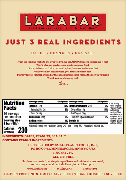 Find Lara Bar Calories & Nutrition Facts | MyFitnessPal Search MyFitnessPal for calories, carbs, and nutritional contents for Lara Bar and over 2000000 other foods at MyFitnessPal. LÄRABAR | Our Products Original LÄRABAR ®, the Original Fruit & Nut Bar ™, is a delicious gluten free blend of unsweetened fruits, nuts, and spices. Made from whole food, each indulgent flavor contains no more than 9 ingredients - minimally processed, and as close to their natural state as possible. Food Values & Special diets Where to find us Privacy Policy