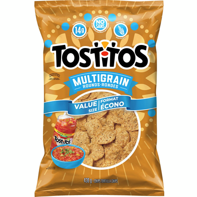 TOSTITOS Multigrain Rounds Tortilla Chips | TOSTITOS Pour a bag of Tostitos ® Multigrain Rounds tortilla chips, with your favourite Tostitos ® salsa, or serve them up as nachos and watch your guests make them disappear. Share Nutrition Amount per 50 g serving (34 chips) % Daily Value Calories 260 Fat 13 g 20 % Saturated 1.5 g 9 % + Trans 0 g Cholesterol 0 mg 0 % Sodium 200 mg 9 % Carbohydrate 33 g