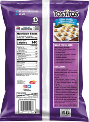 TOSTITOS® Multigrain SCOOPS!® TOSTITOS® Multigrain SCOOPS!® Tortilla Chips give you a delicious three grain blend in a shape that lets you dip a little or a lot! ... Nutrition Facts. Serving Size: 28g: Amount Per Serving: Calories: 140: Calories from Fat: 63 % Daily Value* Calories 140: Fat 7g: 11%: Saturated 1g: 5%: Trans 0g: Cholesterol 0mg: 0%: