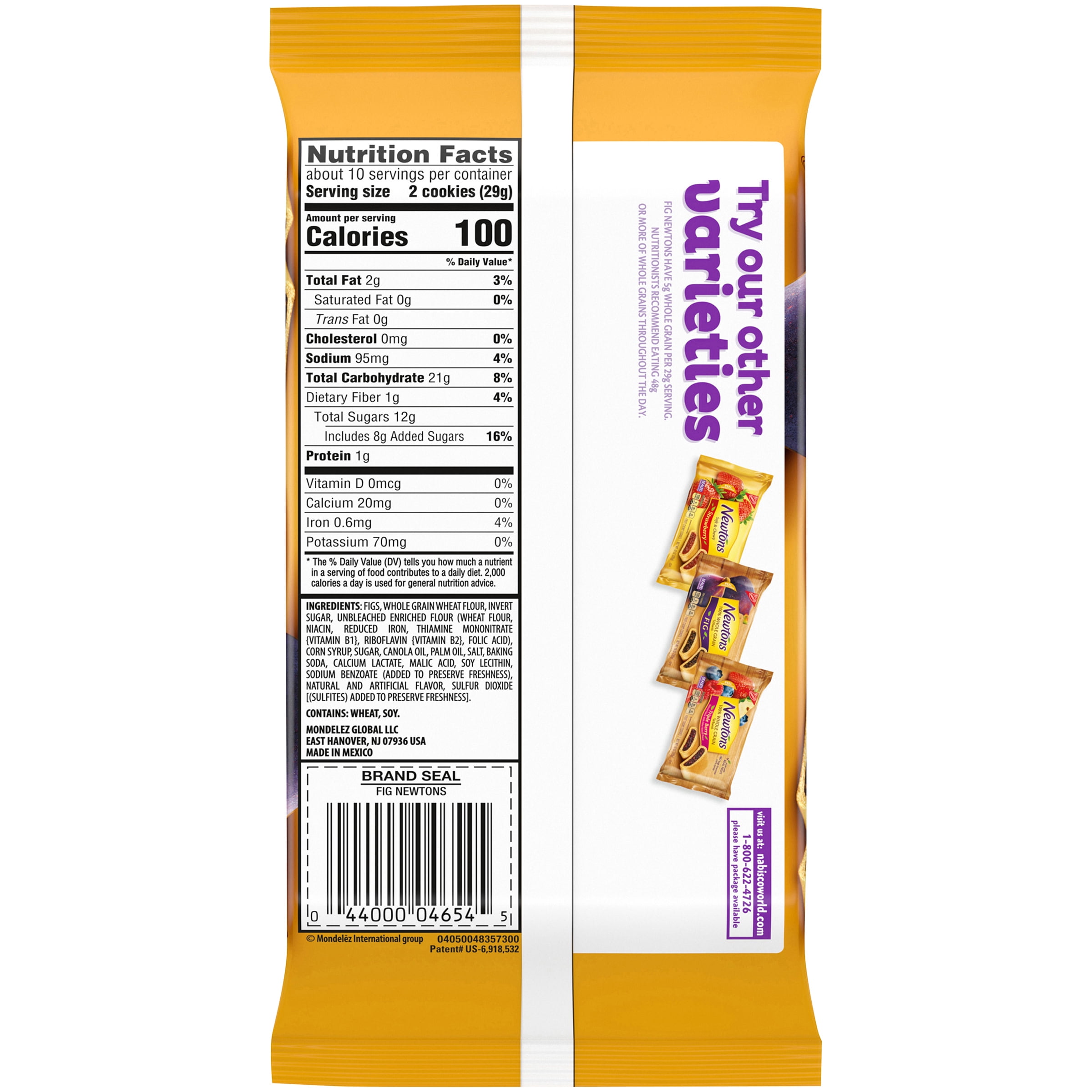 Calories in Fig Newtons Fig Newtons and Nutrition Facts - FatSecret Fig Newtons Nutrition Facts Serving Size 2 cookies (28 g) Amount Per Serving Calories 100 % Daily Values* Total Fat 2.00g 3% Saturated Fat 0.000g 0% Trans Fat 0.000g Cholesterol 0mg 0% Sodium 90mg 4% Total Carbohydrate 21.00g 8% Dietary Fiber 1.0g 4% Sugars 12.00g Includes 8.00g Added Sugars 16% Protein 1.00g Vitamin D 0mcg 0% Calcium 20mg 2% Iron