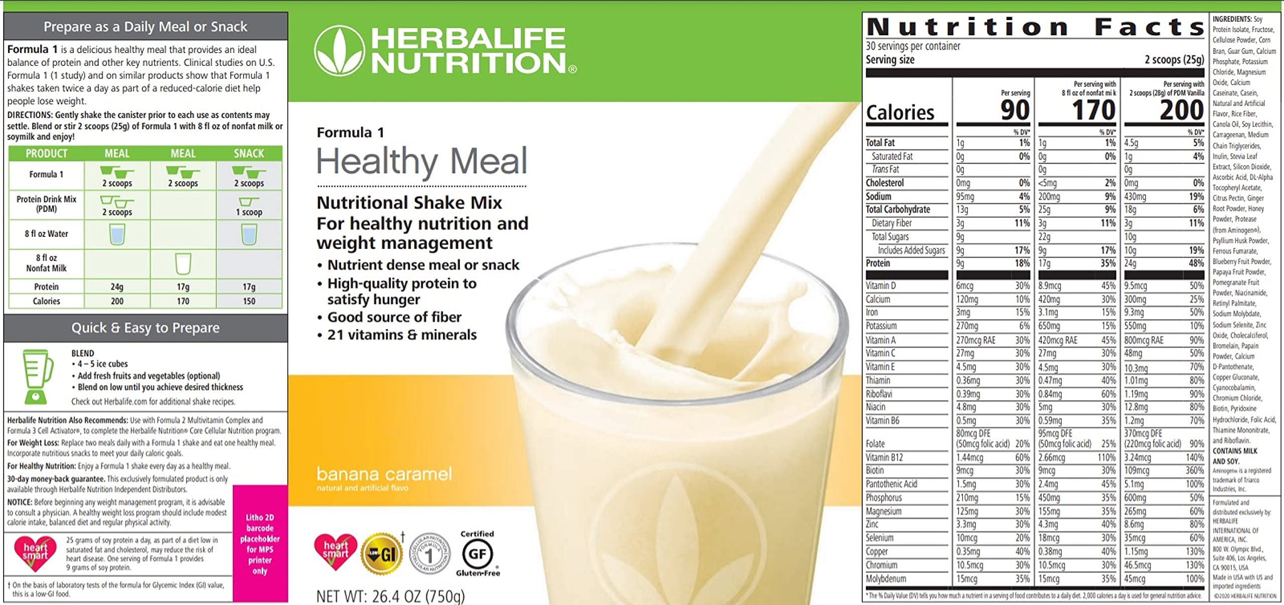 Herbalife nutrition what is in shakes? When used as directed on the label, all Herbalife Nutrition products are completely safe. To ensure consumer safety, we advise anyone with a medical condition or dietary restrictions to consult with their doctor before using this product. ... The award-winning Formula 1 Meal Replacement Shake from Herbalife Nutrition now vegan! In 2019, we ... Herbalife Review | Are These Shakes As Bad As People Say? - LatestFuels Herbalife Formula 1 Ingredients Herbalife Formula 1 Nutrition Label Carbohydrates Based on 170kcal serving prepared with 8fl oz of non-fat milk: Total Carbs: 25g, 9% of DV. Net Carbs: 22g, (Total Carbs - Dietary Fiber - Non-digestible Carbs). Sugars: 22g. Of Which Added: 8g, 17% of DV. Fiber: 3g, 11% of DV. Herbalife Formula 1 Nutritional Shake Mix, French Vanilla, 750 Gram Ingredients Soy Protein lsolate. fFructose, Callulose Powder, Coin Bran, Artilicial frencdh Vanila fRarot Guar Gum, Potassum Chloride. Calcium Phosghate, Calcium Caseinate, Casein, Rice Fiber, Soy Lecithin, Canola Oil, Medium Chain Triglycendes, Carfageenan, DL-Methionine. Herbalife Shakes For Weight Loss - TheSuperHealthyFood How to prepare Herbalife shakes? 1. Gather the following ingredients: Low-fat milk; ½ cup of fruit (it can be banana, strawberries, or pineapple) Herbalife Formula 1 (shake) Herbalife Formula 1 Nutritional Shake Mix $52.69; 2. Add 230 ml of cold/tap water to a blender or 120 ml of low-fat milk (soy milk is also ideal)