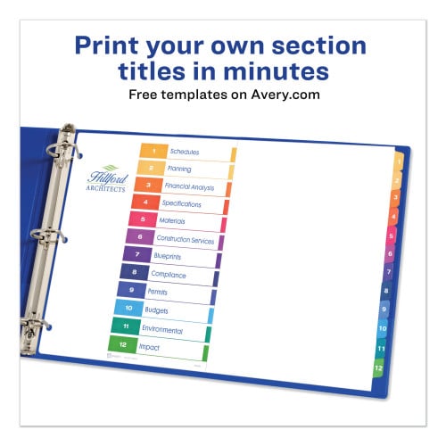 Avery Ready Index Dividers, 12-Tab, Customizable TOC, Paper, Multicolor ... Avery Ready Index Jan-Dec 12 Tab Binder Dividers, Customizable Table of Contents, Classic Multicolor Tabs, 6 Sets (11830) 3. 3+ day shipping. $18.39. Avery Ready Index 12 Tab Binder Dividers, Customizable Table of Contents, Multicolor Tabs, 6 Sets (11196) 88. 3+ day shipping. Best seller.