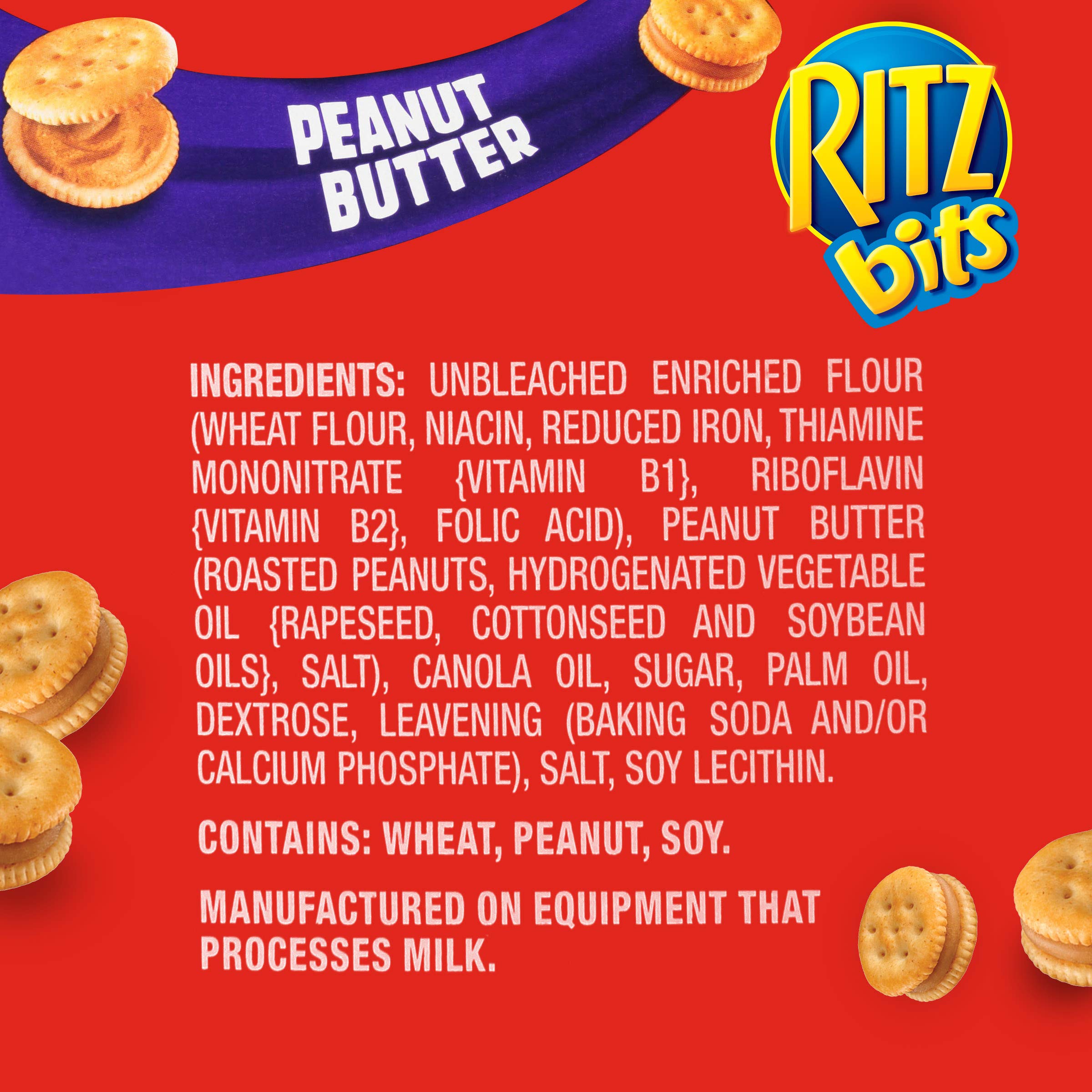Crackers, peanut butter filled (Ritz), sandwich nutrition facts... Crackers, peanut butter filled (Ritz), sandwich contains 337 calories per 70 g serving. This serving contains 18 g of fat, 5.3 g of protein and 40 g of carbohydrate. The latter is 7 g sugar and 1.8 g of dietary fiber, the rest is complex carbohydrate. Ritz Peanut Butter Cracker Sandwiches - Family Size - Target unbleached enriched flour (wheat flour, niacin, reduced iron, thiamine mononitrate {vitamin b1}, riboflavin {vitamin b2}, folic acid), roasted peanuts, canola oil, sugar, dextrose, wheat starch, palm oil, salt, high fructose corn syrup, leavening (calcium phosphate, baking soda), soy lecithin, cornstarch. Allergens & Warnings: