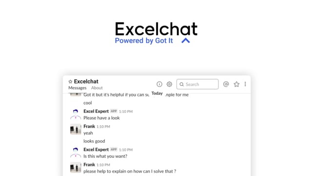 Excelchat: Spreadsheets Solved - YouTube Got It - Experts in seconds Excelchat - Chrome Web Store - Google Chrome With Excelchat, a solution to your specific problem is guaranteed. By installing Excelchat Chrome extension, you will always have a quick and reliable way to get your Sheet done! Get Formulas working Need help debugging VLOOKUP function or that pesky looking Sumif formula? We have got your sheet covered. Generative AI + Human-in-the-loop Solutions | Excelchat A simple subscription model used by thousands of Microsoft Office 365 users to achieve on-demand gains in productivity every day. TRY EXCELCHAT NOW. "The person helping me anticipated my needs. He/she first gave me concise instructions and after a short while, "sensing" that I was having trouble, sent attachments which illustrated the ... Excelchat for Slack - Product Information, Latest Updates, and Reviews ... Excelchat for Slack. Collaborate with real Excel and Google Sheets Experts right from Slack! Excelchat connects you to a spreadsheet Expert via 1-1 chat messaging and shared worksheet. Anytime, anywhere, 24x7. 6yr ago.