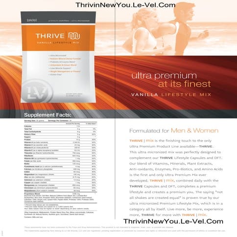 happy being nourished - Solutions 4 Health with a complete nutritional profile plus a unique matrix of plant-based polyphenols and aminos, happy being nourished is everything you need to thrive in one daily shake. pure quality & pure convenience delivered straight to your door, with only 100-110 calories, 16g of protein, and 0g of sugar. plus 24/7 customer service. Nutritional Facts - Thrive Ice Cream 200 Queensway-Suite B Searcy, AR 72143 Info@ThriveforHealthcare.com 855-376-9367 Thrive shake Nutrition Facts & Calories - Inlivo NUTRITION FACTS (% of daily value based on 2000 calories per day) Protein. Carbs. Fiber. Fat. Saturated Fat. Cholesterol. Sodium. Added Sugar. HOW TO BURN THOSE CALORIES. ... Nutrition Facts. Thrive shake. Serving Size: 1 packet (35g) * Amount Per Serving ; Calories: 110 cal : Calories from Fat: 18 cal % Daily Value : Total Fat: 2 g : 3.1% ...