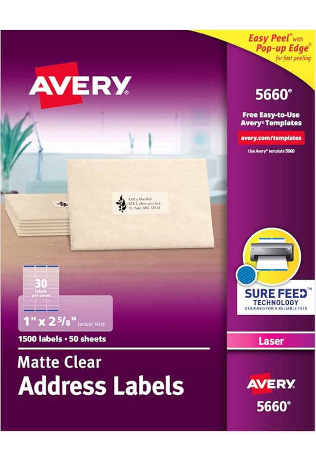 Avery 5660 Laser Labels, Address, 1-Inch X2-5/8-Inch, 1500/Bx, Matte Clear Avery 5660 Laser Labels, Address, 1-Inch X2-5/8-Inch, 1500/Bx, Matte Clear Visit the AVERY Store 18 ratings About this item Sold as 1500/Box. Perfect for special occasions. Labels virtually disappear on colored and textured surfaces. With patented Easy Peel label sheets, just bend the sheet to expose the Pop-up Edge for fast peeling.