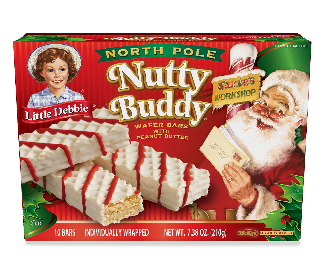 Little Debbie North Pole Nutty Buddy Wafer Bars, 10 ... Add something scrumptious to their stockings this holiday. Little Debbie North Pole nutty buddy Wafer Bars are flying directly to your pantry from Santa's sleigh. Just in time for Christmas, this crunchy, irresistible treat is a perfect blend of sweet and salty with a seasonal twist!
